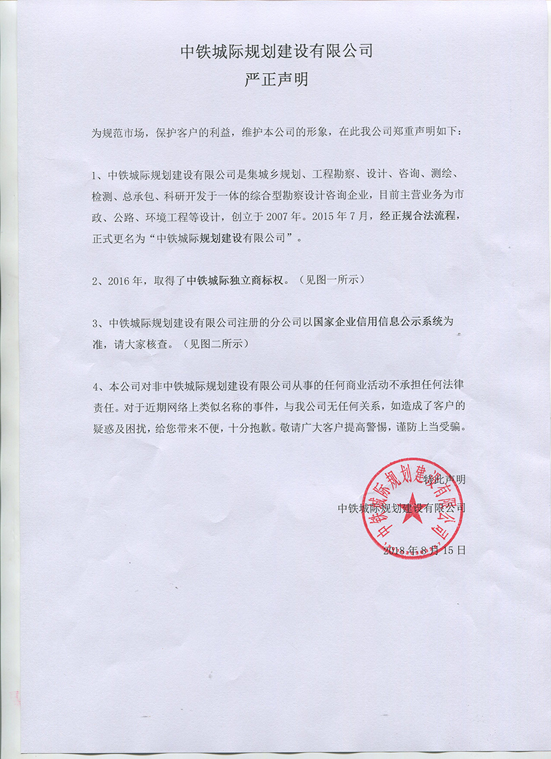 中鐵城際規(guī)劃建設(shè)有限公司 嚴(yán)正聲明