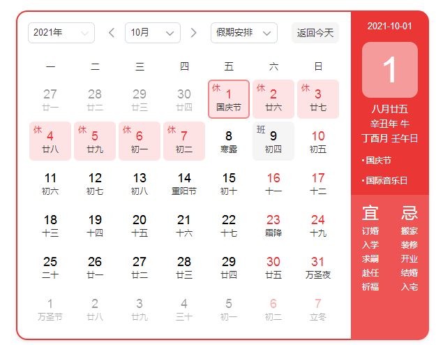 1、10月1日至7日放假調(diào)休,共7天。9月26日(星期日)、10月9日(星期六)上班。