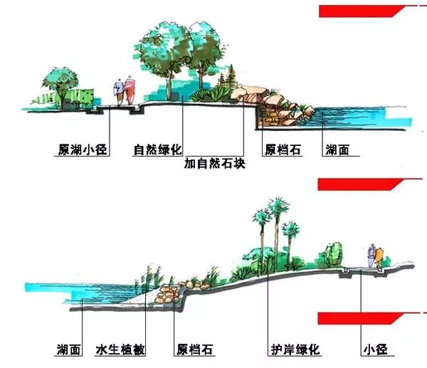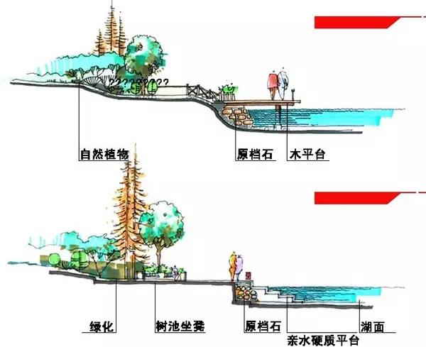 駁岸的植物配置很重要,既能使岸上的景色和水融為一體,又對水面空間的景觀起著主導(dǎo)的作用。駁岸一般分為土岸,石岸,混凝土岸等等,自然的或規(guī)則的。