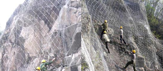 主動防護系統是用以鋼絲繩網為主的各類柔性網覆蓋或包裹在需防護的斜坡或巖石上,以限制坡面巖土體的風化剝落或破壞以及危巖崩塌(加固作用)。由于這一系統的開放性,地下水可以自由排泄,避免了由于地下水壓力的升高而引起的邊坡失穩問題;該系統除對穩定邊坡有一定貢獻外,同時還能抑制邊坡遭受進一步的風化剝蝕,且對坡面形態特征無特殊要求,不破壞和改變坡面原有地貌形態和植被生長條件,其開放特征給隨后或今后有條件并需要時實施人工坡面綠化保留了必要的條件,綠色植物能夠在其開放的空間上自由生長,植物根系的固土作用與坡面防護系統結為一體,從而抑制坡面破壞和水土流失,反過來又保護了地貌和坡面植被,實現最佳的邊坡防護和環境保護目的。