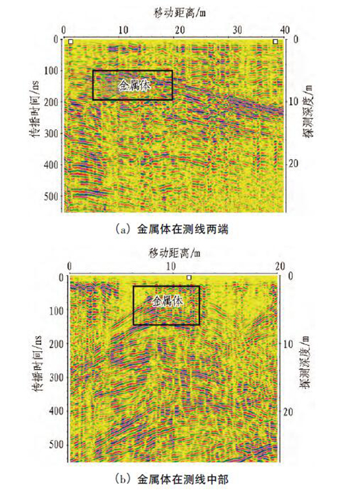 1) 地質(zhì)雷達(dá)探測(cè)時(shí)需將金屬物體移至測(cè)線外一定距離。對(duì)于會(huì)對(duì)探測(cè)結(jié)果產(chǎn)生干擾又無法移走的干擾體,應(yīng)詳細(xì)記錄其相關(guān)信息,包括干擾體的屬性與大小以及干擾體與測(cè)線的相對(duì)位置關(guān)系等,并通過信號(hào)處理從雷達(dá)圖像上識(shí)別或剔除干擾波,降低誤判率。