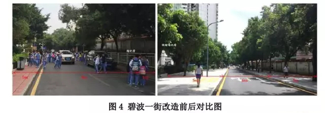 ● 碧波一街:原雙向2 車道機(jī)動車道寬度從8 米壓縮為6 米,利用兩側(cè)消極的綠化帶,將兩側(cè)人行道寬度從1 米加寬到5 米。