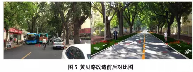 ● 黃貝路:原10 米機(jī)動車道壓縮為7 米,在兩側(cè)各設(shè)置1.5 米寬自行車道,解決自行車出行和地鐵接駁需要。