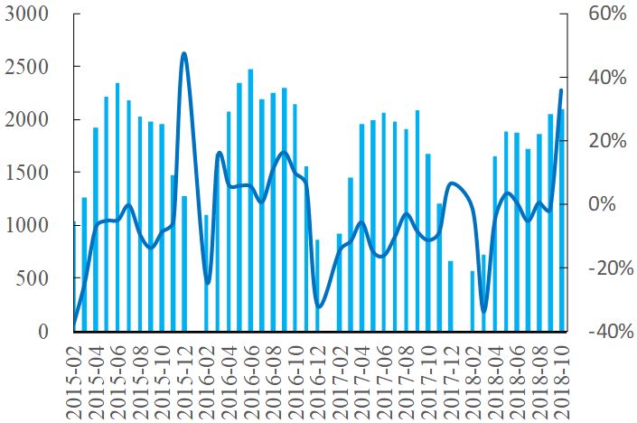 隨著政策邊際寬松逐步向執行層面傳導,基建投資企穩回升。9月基建投資增速-1.8%,單月增速拐點出現;10月基建投資增速6.7%,單月增速轉正;1-11月狹義基建投資增速3.7%與1-10月持平,11月基建投資1.41萬億(+3.7%),基建投資增速已呈筑底回升趨勢。