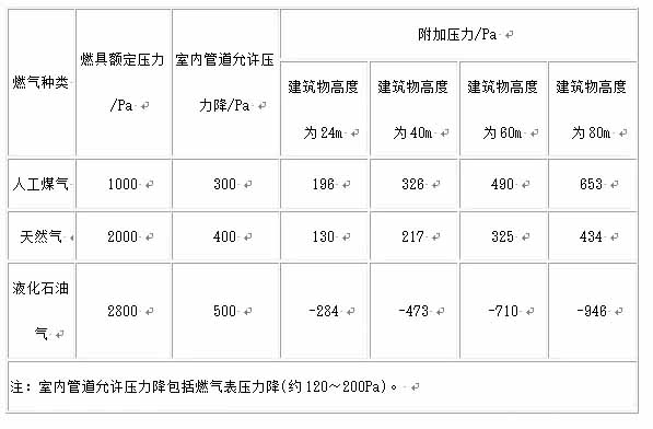 燃氣種類 燃具額定壓力/Pa 室內管道允許壓力降/Pa 附加壓力/Pa 建筑物高度為24m 建筑物高度為40m 建筑物高度為60m 建筑物高度為80m 人工煤氣 1000 300 196 326 490 653 天然氣 2000 400 130 217 325 434 液化石油氣 2800 500 -284 -473 -710 -946 注:室內管道允許壓力降包括燃氣表壓力降(約120~200Pa)。