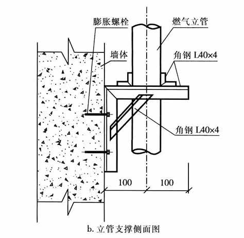 隨著建筑物層數的增加,燃氣立管的長度也變長,管道的自重變大,所以應設置管道的固定支架,使固定支架與建筑物成為一體,防止因管道下沉而引起引入管受力折斷或變形引起倒坡。一般固定管道的做法有: