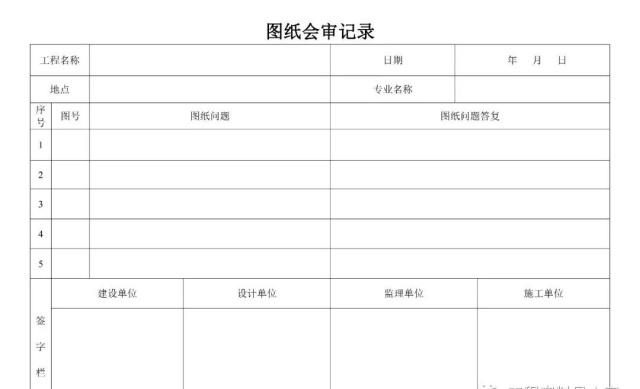 備 注:上表為城市(市政)道路工程國標使用表格,各地表格存在差異,優先選用各地方要求的相應表格,其次考慮使用國標表格,再次為了方便圖紙會審分類管理,也可參考使用下表。圖紙會審記錄需各單位項目負責人簽字,加蓋公章,作為施工圖紙的補充,后期為結算工程量提供依據。(以上僅供參考)