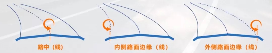 另外一個就是軸線,為了保證超高過渡的平穩連續,需要在路面的三個軸線,也就是路中線、內存路面邊緣線或外側路面邊緣線將路面進行旋轉。從而達到雙向橫坡果斷到單向橫坡的目的。