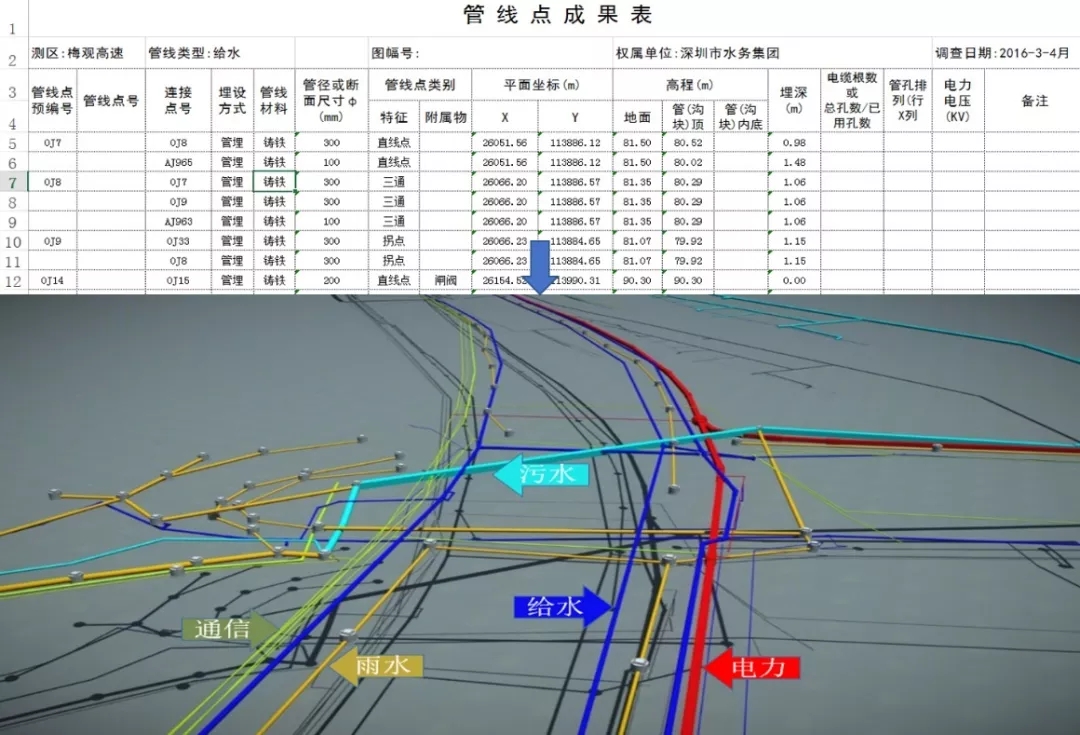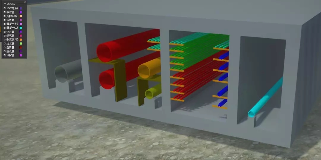 重建管網(wǎng)現(xiàn)狀模型。項目區(qū)域地下管網(wǎng)錯綜復(fù)雜,為探明復(fù)雜的管網(wǎng)現(xiàn)狀,避免設(shè)計延誤。項目組研發(fā)管網(wǎng)建模工具,重構(gòu)了完整的地下管網(wǎng)BIM模型,準確定位,便于管廊設(shè)計與遷移。