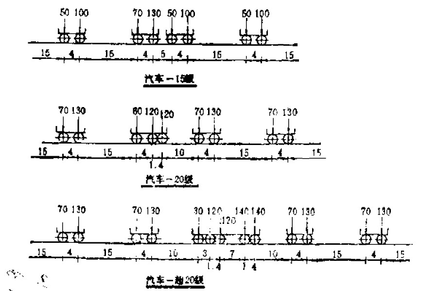 下圖是汽車車隊的縱向布置,單位是(kN),圖中可以看出汽20對應的最重車為30噸,汽超20的最重車為55噸,新聞報道中好像搞混淆了這兩個。