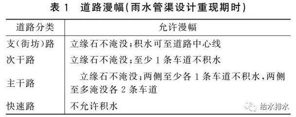 《Urban Storm Drainage Criteria Manual》對于內(nèi)澇防治設(shè)計(jì)重現(xiàn)期時(shí)的道路積水有詳細(xì)規(guī)定,我國《室外排水設(shè)計(jì)規(guī)范》有類似規(guī)定,見表2。