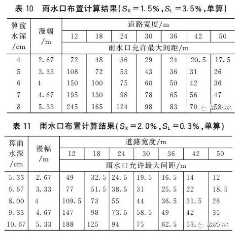 (4)如果以國家標(biāo)準(zhǔn)圖集《雨水口》中的箅前水深4 cm(SX=1.5%,SL=0.3%)作為雨水口布置的依據(jù),那么對于寬度大于等于18 m的道路,其雨水口允許最大間距均小于國家規(guī)范推薦值(25~50 m)。