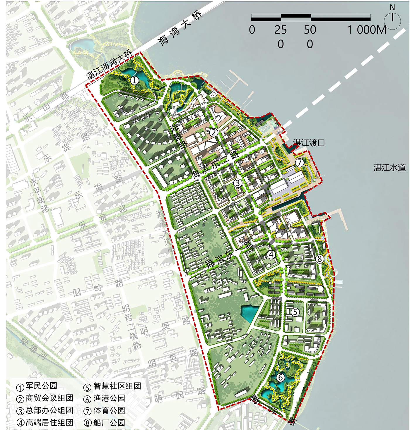 重點對七個核心片區進行詳細城市設計:海灣大橋以北環龍王灣三個核心片區,分別為赤坎商貿服務區、海東創新服務中心、沙咀海洋科技園。海灣大橋以南四個核心片區,分別為濱海活力集聚區、南調低碳智慧園、麻斜海味半島、南三風情旅游。另外結合近期實施項目,對霞山中國海鮮美食城進行城市設計提升。