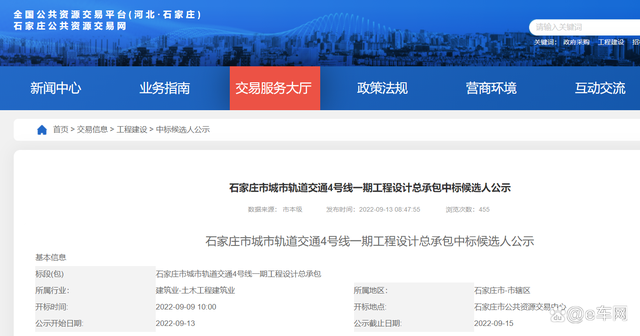 石家莊市城市軌道交通4號(hào)線一期工程設(shè)計(jì)總承包中標(biāo)候選人公示