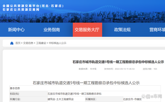 石家莊市城市軌道交通5號(hào)線一期工程勘察總承包中標(biāo)候選人公示