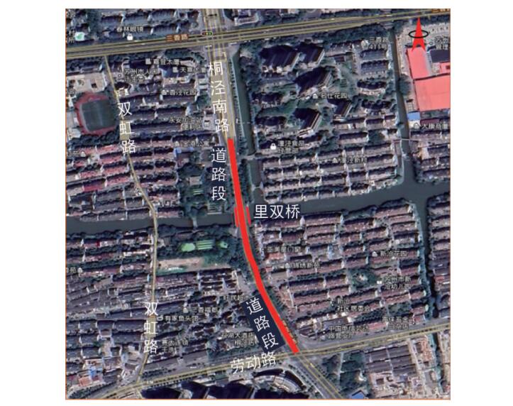 里雙橋重建工程項目范圍為從桐涇南路 - 三香路交叉口下穿段南到桐涇南路 - 勞動路交叉口北側,總長度 502 m。
