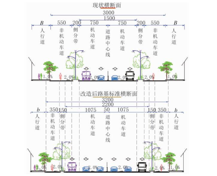 改造時采用現(xiàn)狀道路寬度不變,通過壓縮非機動車道和人行道的方式,雙向各增加 1 條機動車道。道路改造后斷面布置為 b 人行道 +3.5 m 非機動車道 +1.5 m 側分帶 +22 m 機動車道 +1.5 m 側分帶 +3.5 m 非機動車道 +b 人行道。機動車道路面寬度為 22 m,具體布置為 0.25 m 路緣帶 +2×3.5 m機動車道 +3.25 m 機動車道 +0.25 m 路緣帶 +0.5 m中央分隔帶護欄 +0.25 m 路緣帶 +3.25 m 機動車道 +2×3.5 m 機動車道 +0.25 m 路緣帶。b 為人行道寬度,其中橋面人行道寬度為 2.5 m,K0+387~K0+417 段東側人行道寬度在 2.1~2.7 m,其余段人行道寬度均在 3 m 以上。該方案的優(yōu)點是通過拆除原側分帶和壓縮非機動車道方式實現(xiàn)雙向 6車道,通過新建側分帶實現(xiàn)四排綠化,符合老城區(qū)城市景觀綠化需求(見圖 2)。