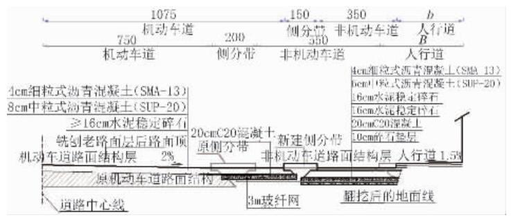 (2)針對拆除側分帶、壓縮非機動車道改建為機動車道段,建議采用 20 cm C20 混凝土進行處理,新舊路基搭接頂面鋪設 3 m 玻纖網(wǎng)防止反射裂縫產(chǎn)生。