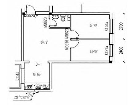 在室內(nèi)鋪設(shè)燃?xì)夤芫€時(shí),必須注意:①不能鋪設(shè)在潮濕或含有腐蝕性介質(zhì)的房間,也不能將其引入臥室,特別是在臥室、浴室或衛(wèi)生間里;②嚴(yán)禁通過易燃、爆炸物品、配電間、變電所、煙、風(fēng)道等場所;③橫穿臥房、衛(wèi)生間或地下室的管道,應(yīng)在套管內(nèi)安裝焊接;④如需放置于潮濕或有腐蝕性介質(zhì)的室內(nèi),則應(yīng)采用防腐蝕措施;⑤管道穿越樓板、樓梯平臺(tái)、墻壁、隔墻時(shí),應(yīng)將管線置于套管內(nèi)。⑥安裝燃?xì)庠畹姆块g凈高不宜低于2.2米,安裝熱水器的房間應(yīng)該宜大于2.4米。如圖3所示,室內(nèi)廚房豎管的設(shè)計(jì)。
