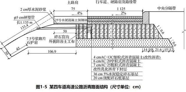 1)路面邊緣排水系統由縱向排水管、橫向出水管、集水溝和反濾織物(土工布)等組成,如圖1-9所示。