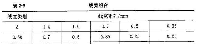 2)每張圖上的圖線線寬不宜超過3種?;揪€寬((b)應根據圖樣比例和復雜程度確定。線寬組合宜符合表2-5的規定.