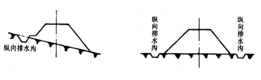 上圖用于排出路堤范圍內的地面水:當地面平坦時設于路基的兩側;當地面較陡時可設置于迎水面一側。