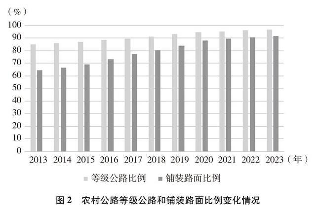 技術等級逐年提高。截至2023年底,農村公路等級路②里程及比例分別達到445萬公里和96.8%,鋪裝路面里程及比例分別達到422萬公里和91.8%,十年間分別提高了11.9個百分點、27.2個百分點。