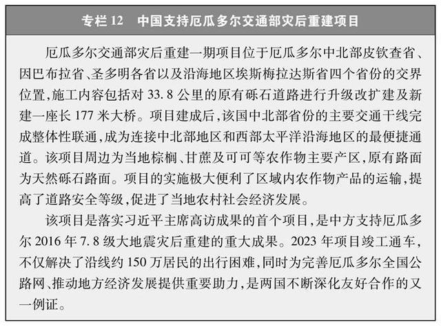 中國積極支持并參與發展中國家的農村公路建設項目,在其他發展中國家援建了大批農村公路基礎設施項目,向世界農村公路領域分享中國方案、中國經驗。通過參與項目建設、提供技術支持和人力資源,幫助當地改善農村地區道路基礎條件(專欄12),極大方便當地人民出行,大幅度降低物流成本,增強城鄉互動,促進當地農產品的流通和市場接入,對消減貧困、改善民生、提升人民群眾的生活水平,促進當地經濟社會發展具有重要意義,深受當地百姓好評,如中國無償援建的馬達加斯加首都郊區公路項目,便利了馬哈扎扎鎮雞蛋運輸,促進了當地蛋雞養殖業發展,這條路被當地人親切地稱作“雞蛋路”。