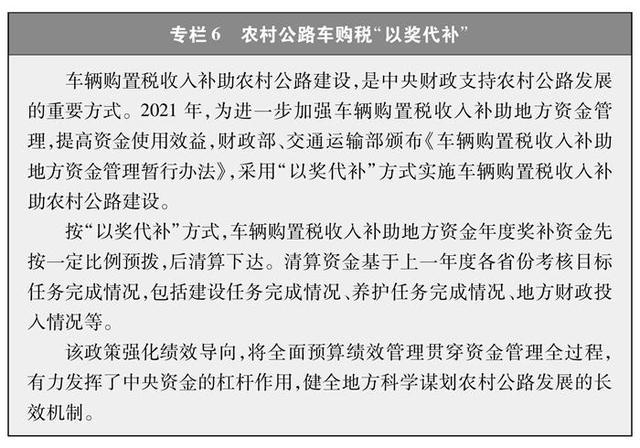 規范高效用好農村公路發展資金。完善車輛購置稅補助地方資金轉移支付制度,利用“以獎代補”方式支持農村公路建設(專欄6),對各級財政用于農村公路的資金實施全過程預算績效管理,提高農村公路資金使用效益,加強農村公路資金使用監管,給資金戴上“緊箍咒”。在資金管理和使用上建立“誰申報誰負責”“誰使用誰負責”的責任機制,確保資金實際足額撥付到位,并按有關規定向社會公開,接受群眾監督。加強農村公路債務風險防控,依法合規籌措債務資金。