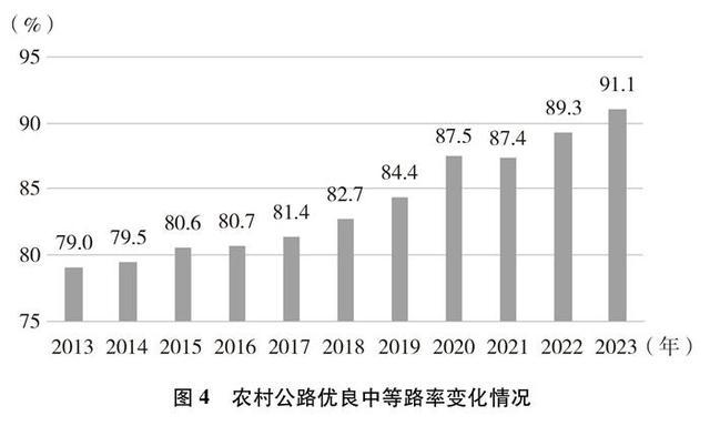 路況水平實現跨越式提升。持續加大養護投入,全面開展日常養護,大力實施養護工程,農村公路養護工程年均比例超5%。十年來,累計實施修復養護工程184萬公里,優良中等路率④從79%上升至91.1%,基本實現“有路必養、養必到位”。